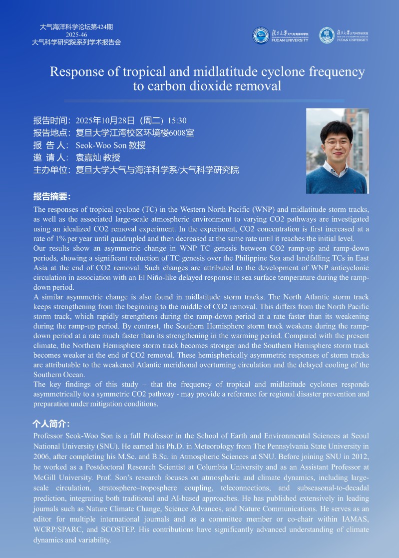 2025/10/28 -Seok-Woo Son- Response of tropical and midlatitude cyclone frequency to carbon dioxide removal