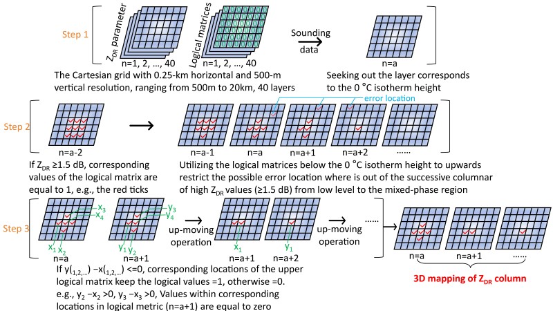 我系张义军教授团队基于广东雷电野外观测试验选定了研究区域内15个涵盖完整生命期演变的孤立雷暴单体,发展了一种适用于孤立雷暴单体云内的ZDR(KDP)柱客观识别方法“3D mapping columns”(图1),可以更优异地识别雷暴生命期内完整的“柱”,尤其是雷暴早期阶段(图2),基于该方法并结合微物理反演手段(冰水含量估算,粒子识别,微物理指纹分析等)探究了雷暴整个生命期(从发展到消亡的雷暴云整个演变过程),闪电活动与ZDR(KDP)柱及微物理特征演变之间到底遵循怎样的物理秩序与潜在机制,这有别于Eric C. Bruning教授团队采用的从闪电活动变化角度或研究区域内过境雷暴的研究方法。