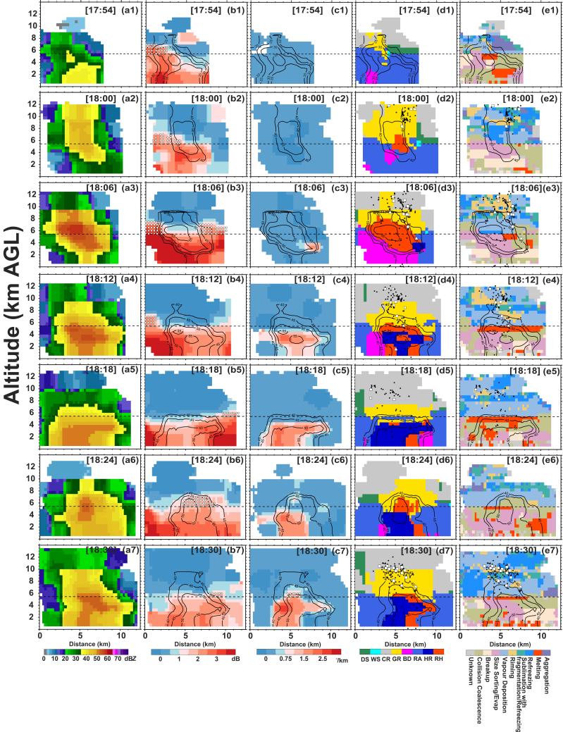 征了即将发生的冰微物理即大量的霰形成,随后通过非感应起电机制促进闪电活动,这种促进脉冲性对流活动或闪电峰值发生的微物理过程,主要是液滴合并形成的云滴被抬升至融化层上方;而在冷云微物理显著的阶段,丰富的霰或冰雹粒子形成,这种大冰相物的融化破碎、泄离导致的较小尺寸液滴被重新抬升至融化层上方,这可能是促进雷暴生命期内后续脉冲性对流活动或闪电峰值发生的微物理途径,并伴随KDP柱的形成,随后回波核心内的KDP柱将会替代ZDR柱指征强上升气流(图3)。本研究将闪电活动与ZDR(KDP)柱及微物理特征演变之间的物理秩序概念化为图4,研究结果揭示了雷暴单体生命期内ZDR柱与KDP柱的形成机制及其与闪电活动的关系。上述相关成果已发表于Atmospheric Chemistry and Physics。