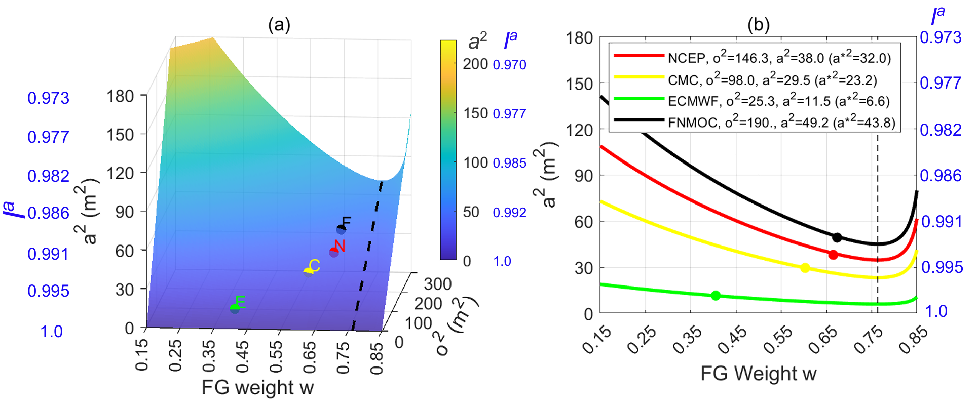 图4 (a)分析误差方差随背景场权重和观测误差方差的变化。(b)给定观测误差方差情况下,分析误差方差随背景误差权重的变化。