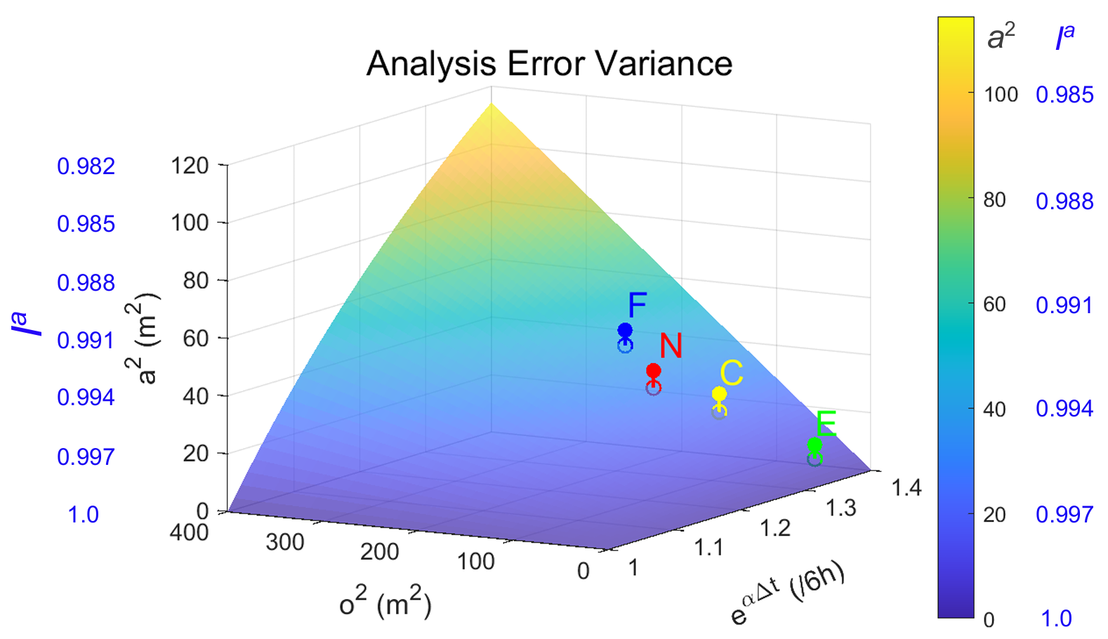 图3 分析误差方差随观测误差方差和模式动力增长率的关系。空心和实心状态分别代表FNMOC (F), NCEP (N), CMC (C), and ECMWF (E)的最优和实际分析误差方差。