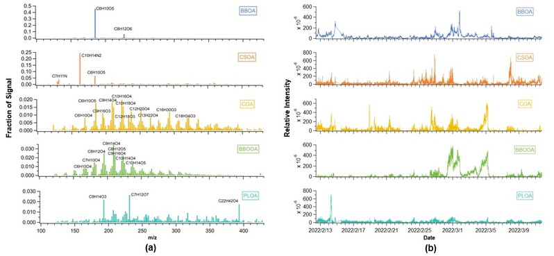 1 | POA因子的质谱与时间序列。图a为五种POA因子(包括生物质燃烧有机气溶胶(BBOA)、吸烟有机气溶胶(CSOA)、烹饪有机气溶胶(COA)、生物质燃烧氧化有机气溶胶(BBOOA)和增塑剂有关有机气溶胶(PLOA)的质谱图,图b为时间序列。