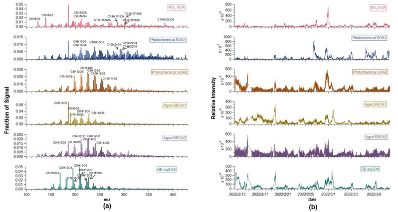 2 | SOA因子化学组成及其时间序列。图a为六种SOA因子(包括NO3SOA, Photochemical SOA1, Photochemical SOA2, Aged BBOA1, Aged BBOA2生物质燃烧液相氧化SOA (BB aqSOA的质谱图,图b为对应时间序列。
