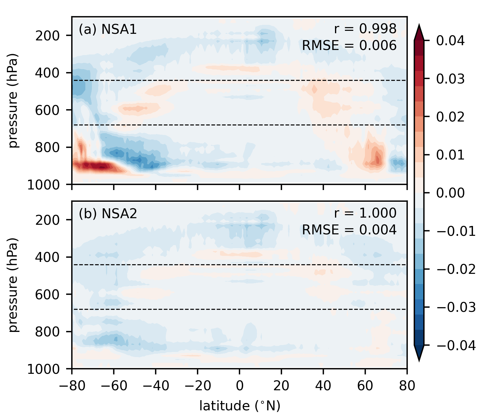 图2. NSA1与NSA2方案基于CloudSat 2006-2019数据模拟的全球云量纬向平均垂直分布相对于CloudSat观测结果的误差分布图。两条虚线表示440 hPa和680 hPa高度,用于划分高云、中云和低云。右上角数字表示方案预测结果相对于CloudSat观测结果的相关系数(r)和均方根误差(RMSE)。