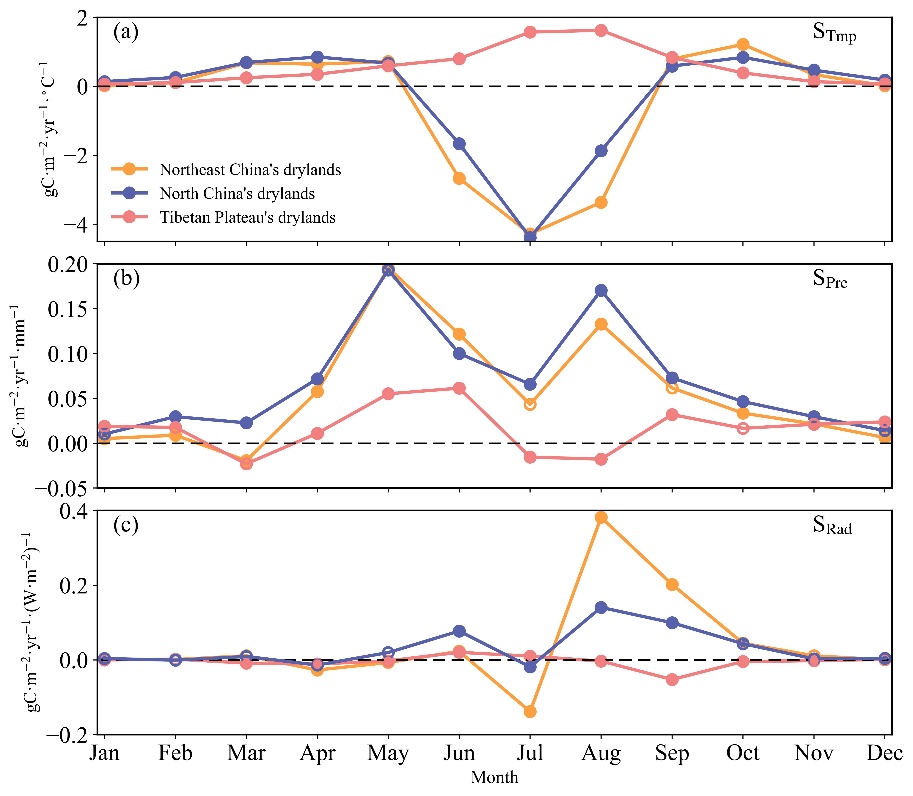 图2. GPP对(a)温度、(b)降水和(c)太阳辐射变化的区域平均敏感性的年循环特征。实心圆表示该区域超过70%的网格中相应变量的敏感性通过了95%置信水平的显著性检验,空心圆则表示通过显著性检验的网格比例未达到70%。