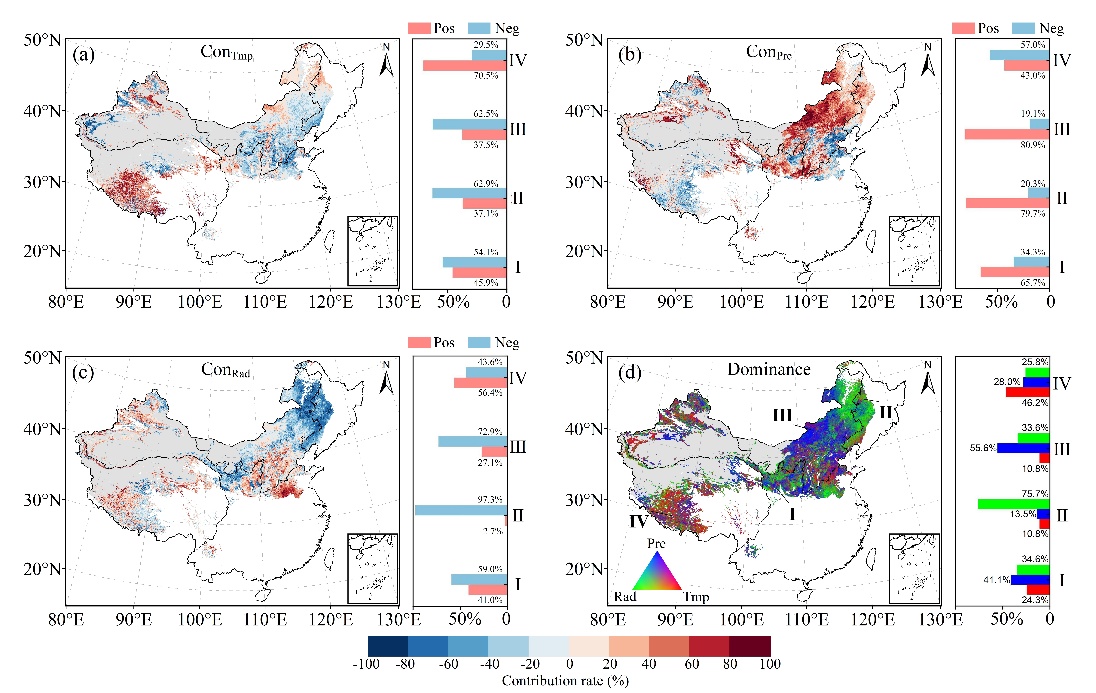 图3. 2001-2020年中国旱区GPP趋势主导气象因子空间分布。(a)-(c)分别为温度、降水和太阳辐射变化对GPP趋势的相对贡献。右侧柱状图显示各气候区(Ⅰ-Ⅳ)正、负贡献区域面积占比。(d)为主导气候因子的空间分布,各格点的主导因子由其最大绝对贡献值确定,右侧图显示各气候区不同主导因子的面积占比。