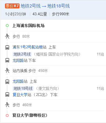 (二)从浦东国际机场到复旦大学(邯郸校区)的线路:乘坐地铁2号线(国家会展中心方向),自“浦东1号2号航站楼站”抵“龙阳路站”后,站内换乘地铁18号线(长江南路方向),抵“复旦大学站”下车,2号口出,步行约1公里,抵复旦大学(邯郸校区)。