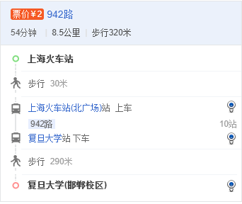 (三)从上海火车站到复旦大学(邯郸校区)的线路:自上海火车站步行约2分钟至上海火车站北广场公交站,乘坐942路公交车(殷行路中原路方向)抵“复旦大学站”下车,步行约500米,抵复旦大学(邯郸校区)。