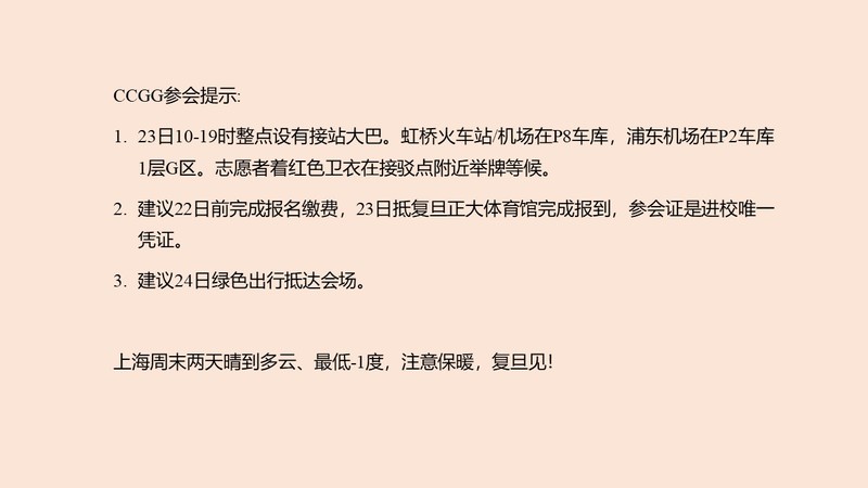 1.会务组将于1月23日在浦东机场、虹桥机场、虹桥火车站设置整点(10:00-19:00)穿梭巴士,可直接乘车前往报到点领取会议资料。2.考虑到会议人员较多,建议1月23日完成会议报到。