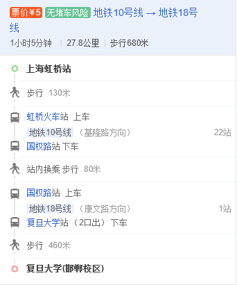 (一)从上海虹桥高铁站/虹桥机场到复旦大学(邯郸校区)的公交线路:乘坐地铁10号线(基隆路方向),自“上海虹桥站”抵“国权路站”后,站内换乘地铁18号线(长江南路方向),经1站抵“复旦大学站”下车,2号口出,步行约1公里。